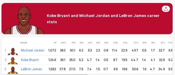 Điều đáng nói là Kobe ghi trung bình 25 điểm mỗi trận trong sự nghiệp của mình, James đã ghi được 27 điểm và Jordan ghi được 30,1 điểm.