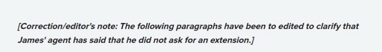 Phóng viên sau đó đã viết một sự điều chỉnh/ghi chú trong bài viết, cụ thể: "Nội dung của bài viết này đã được sửa đổi. Đại lý của James nói rằng ông không yêu cầu Lakers đổi mới sớm."